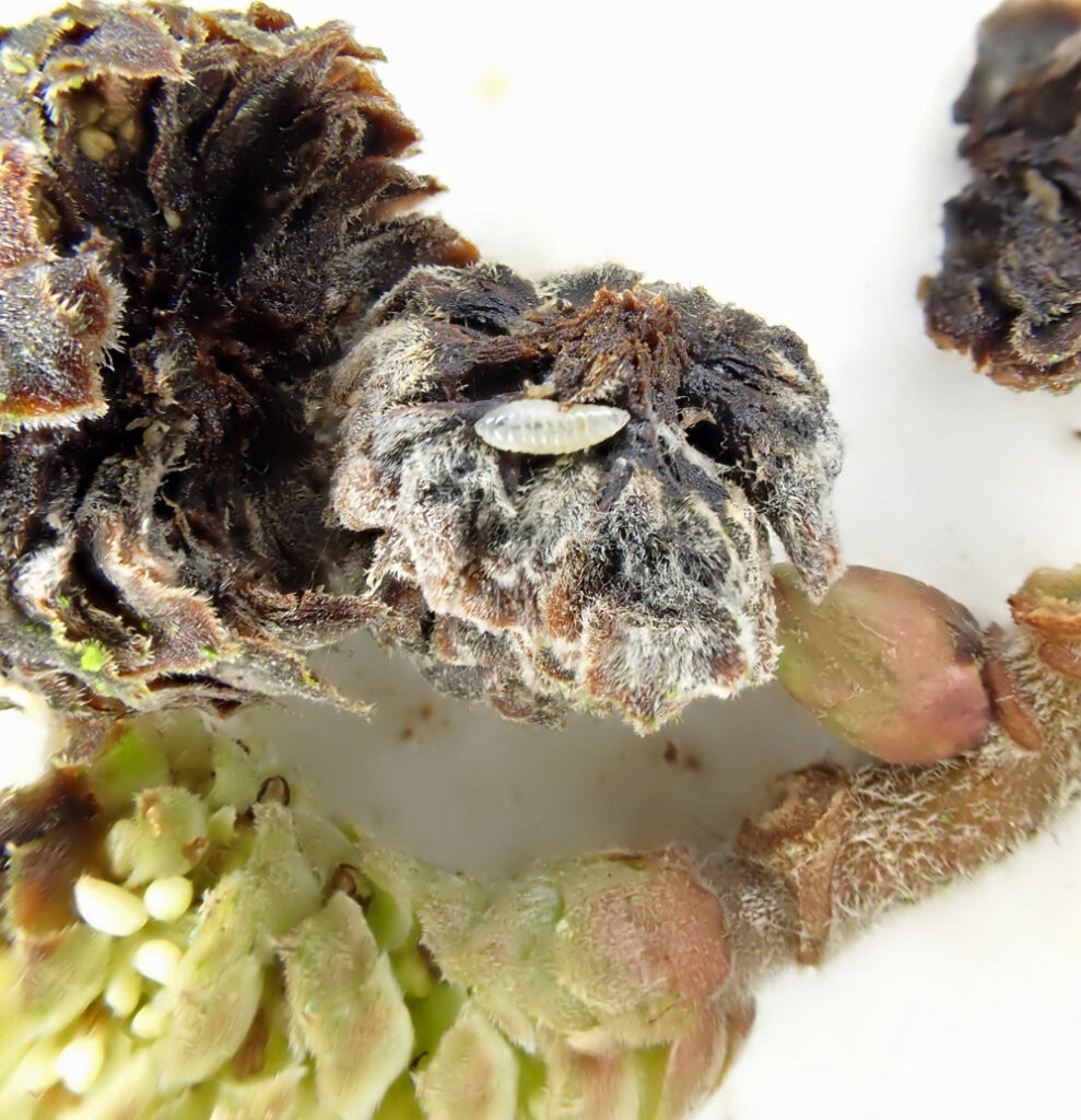 Hazel has also developed a habit this winter of examining Hazel catkins having realised that two gall causers disfigure catkins in similar ways and the catkins must be examined to find the causer. The gall caused by the mite Phyllocoptruta coryli has only been found once this winter, but mites are so tiny, virtually impossible to see and even more difficult to photograph. They are probably all hunkered down now in bark crevices to sit out the winter. However, the gall caused by the midge Contarinia coryli is being found every time a few distorted catkins are taken home, and this was the case at Albert Village Lake. A collection of about ten catkins yielded three larvae. One assumes that the larvae either pupate in the catkin and fall to the ground with it to overwinter or pupate in the ground after the catkin has fallen.