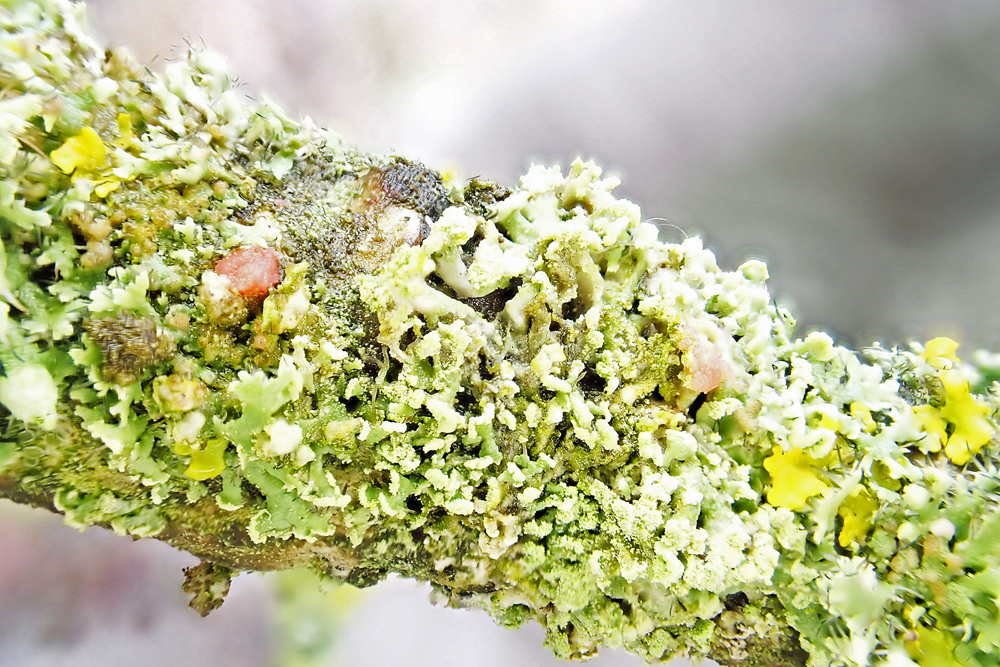 A few lichens were noted. The nitrophiles Xanthoria parietina, Physcia tenella and Physcia adscendens were greatly in evidence, plus occasional small patches of the pollution-resistant Hammered Shield Lichen Parmelia sulcata. Gray-green Disc Lichen Lecidella elaeochroma was found on immature birch saplings. Steve found the bubble-gum-pink lichenicolous fungus Illosporiopsis christiansenii growing on lichen on a twig. A small patch, almost hidden amongst the ground flora on the trackside, of a Cladonia species with beautiful cups was spotted, provisionally identified as Cladonia chlorophaea s.l. and now confirmed by Ivan Pedley.