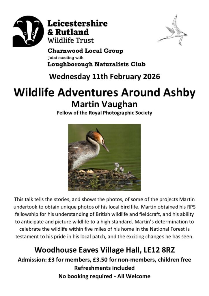 10 May 2025: The Peter Gamble Memorial Lecture. We are delighted to announce that Tim Sexton, Species and Recording Officer, Leicestershire & Rutland Wildlife Trust will be our Speaker for the evening. This will be a special meeting as a tribute to Peter Gamble and will also be the final indoor meeting that the Club will run independently. At this meeting we are hoping to put on a display celebrating the 65th Anniversary of the LNC. If any of our Members have memories/photographs of Club activities or observations they would like to share, please contact Sue Graham on 07939-580069 or email her at jsgraham83@aol.com If anyone would like to help out with creating the display, please also let Sue know – any assistance would be welcome!