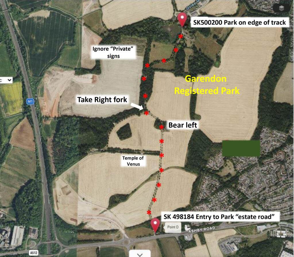 To access this spot, the Estate can be entered at the gate (SK498184 – see attached map) on the Ashby Road (A512). If approaching from the Motorway (J23) direction, go past the half-made-up roundabout and turn left at the Lodge gate where you will see some Jamie Mather – type “for sale” boards. If approaching from the Loughborough direction, you will need to drive past the Lodge gate and do a U-turn at the half-made-up roundabout to get on the correct side of the road.